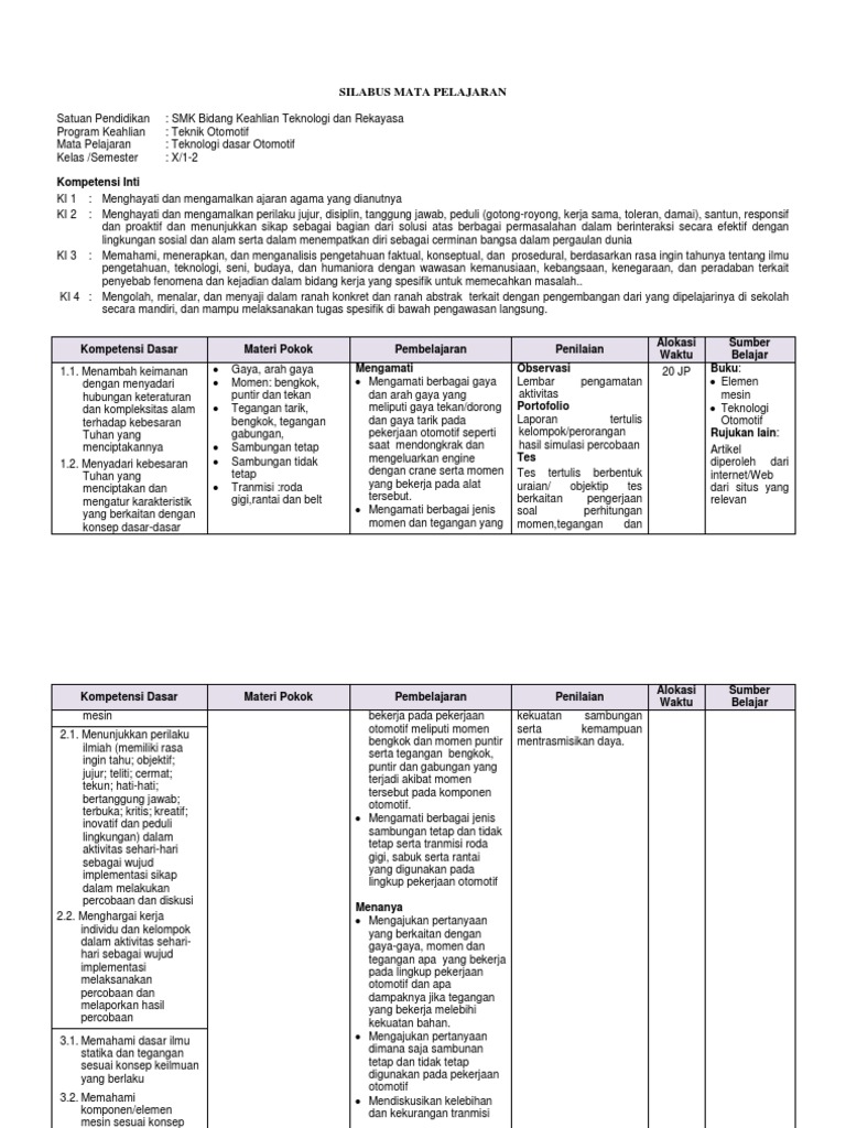 Doc Silabus Mata Pelajaran Teknologi Dasar Otomotif Dasar Bidang Keahlian Teknologi Dan Rekayasa Hengki Mahendra Academia Edu