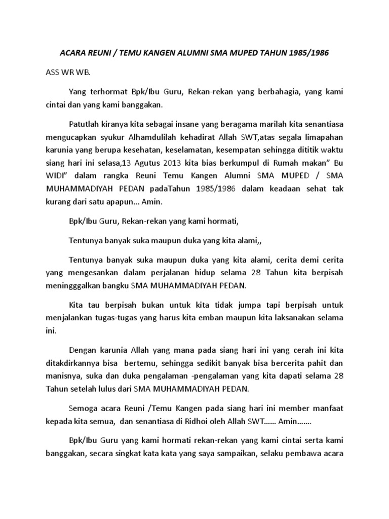 Contoh Susunan Acara Reuni Alumni Sekolah Resmi Tingkat SD SMP SMASMK - Berikut adalah contoh susunan acara reuni yang bisa dijadikan acuan untuk anda yang akan mengadakan reuni secara formal baik di gedung pertemuan maupun di sekolah anda sendiri. Latar Belakang SMP Negeri 247 Jakarta merupakan Sekolah Menengah Pertama yang telah berdiri sejak lama dan menghasilkan lulusan berkompeten dan berguna bagi Ag a ma Bangsa dan. Secara umum acara reuni ini dilakukan oleh sekolah ataupun mahasiswa bahkan komunitas dan organisasi pun melakukannya.