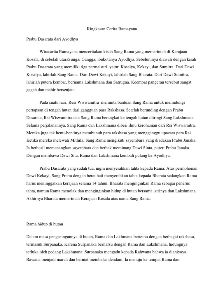 Cerita ramayana bahasa jawa singkat. Ora suwe dumadakan teka salah siji utusan saka Pandu kang anggawa warta yen Prabu Pandu nembe wonten tugas. Sawijining dina ing kerajaan mantili ingkang kerajaan ramanipun dewi shinta asmane prabu janaka. Ramayana Jawa Kuna memiliki 2 dua versi yaitu Kakawin dan Prosa yang bersumber dari naskah India yang berbeda yang perbedaan itu terlihat dari akhir cerita seperti disebutkan tadiSelain kedua versi itu terdapat versi lain seperti.