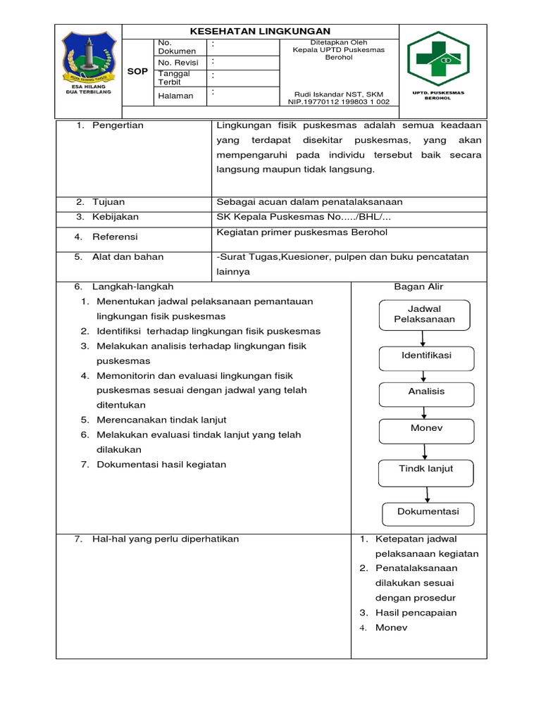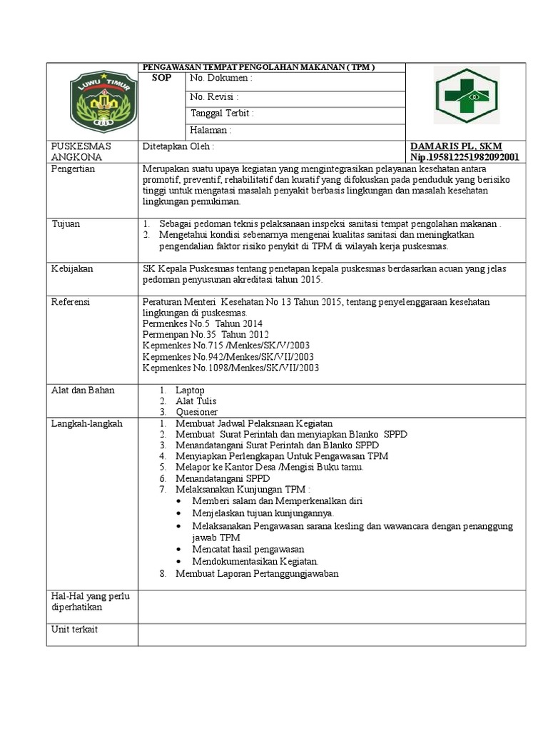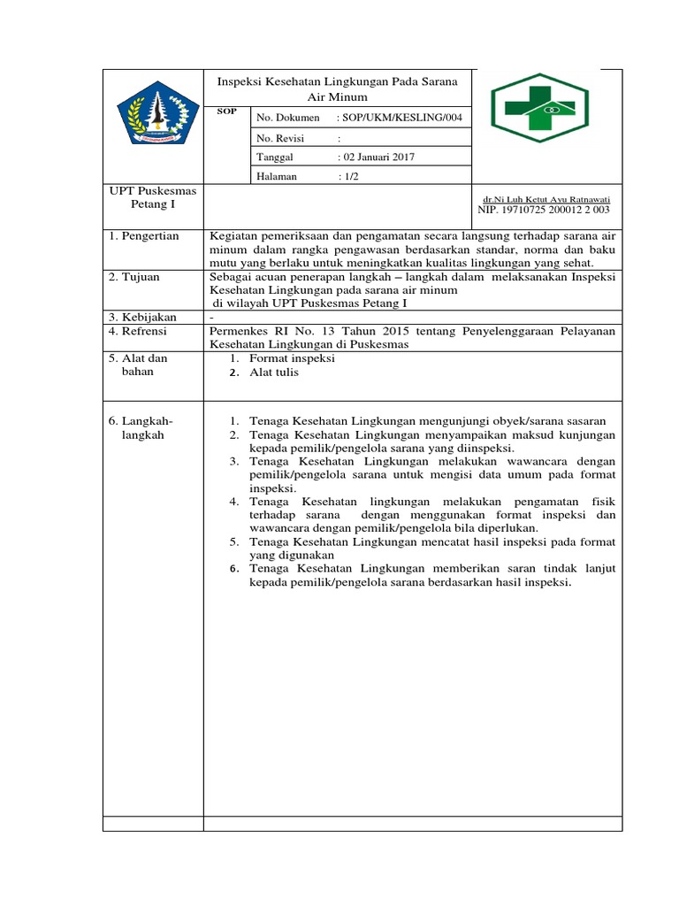 Sop kesehatan lingkungan. 5 Mengomunikasikan SOP secara tertulis kepada para tamu pemasok serta pihak lain yang beraktivitas di lokasi wisata arung jeram. Jasa Transportasi Wisata 4. 19800920 200502 2 00712.