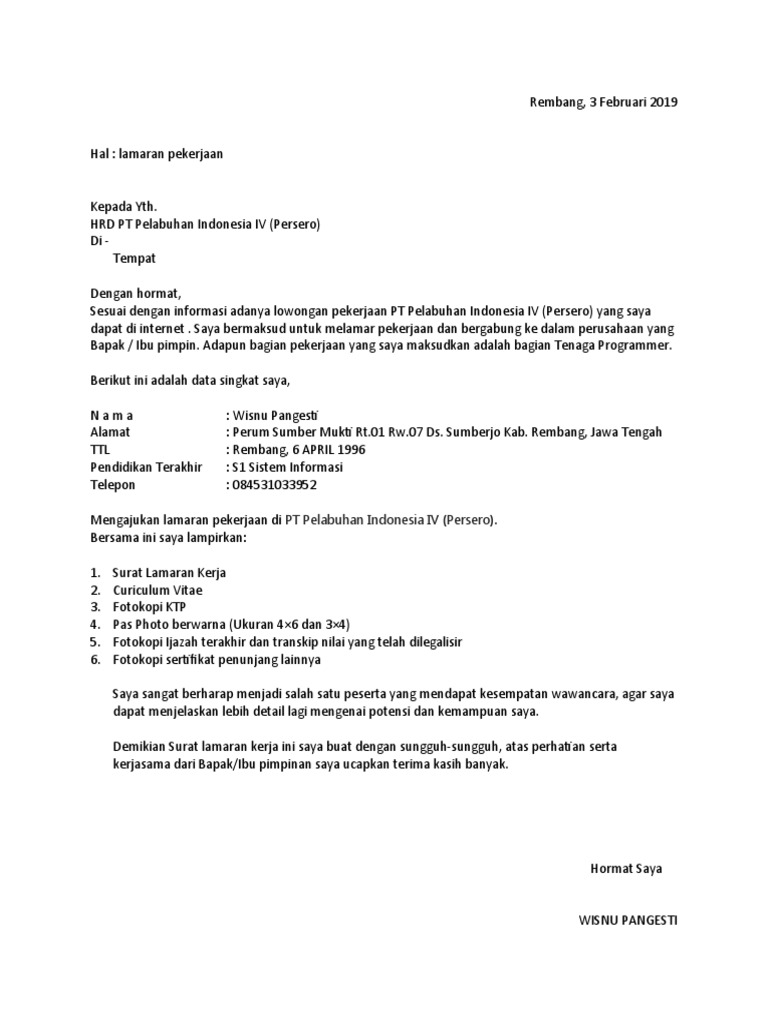 23 contoh surat lamaran kerja di pt pelindo Doc PDF Bila kamu akan melamar pekerjaan Loe harus menulis suratnya dengan struktur yang baik cara membuat nya kamubisa dengan cara tulis tangan atau dikirim via email bikin lah sesuai EYD ber bahasa indonesia singkat resmi simple bisa juga bahasa inggris. My pelindo merupakan aplikasi terpadu untuk interkasi pegawai pelindo iii dan perusahaan. Admin dari blog Barisan Contoh 2019 juga mengumpulkan gambar-gambar lainnya terkait contoh surat lamaran kerja pt pelindo dibawah ini.